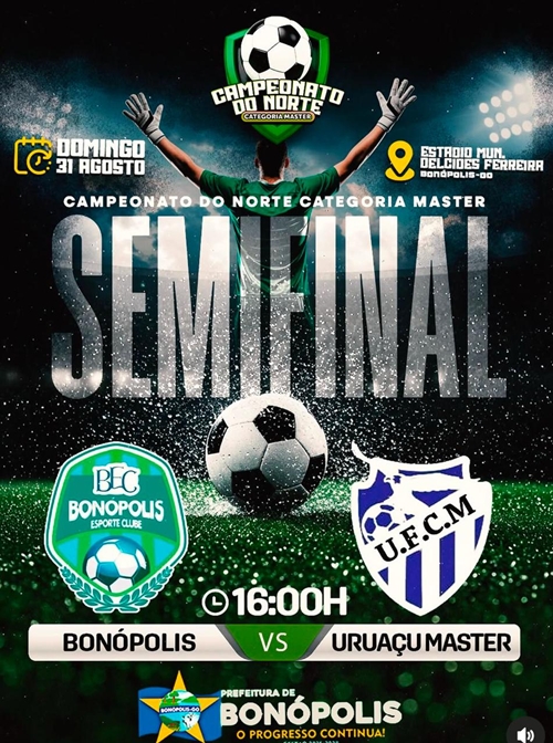 A cidade de Bonópolis se prepara para um grande momento esportivo neste domingo, 31 de agosto, quando será realizada a semifinal do Campeonato do Norte Goiano Master. O jogo acontece às 16h, no Estádio Municipal Delcides Ferreira, e colocará frente a frente as equipes do Bonópolis Esporte Clube e do Uruaçu Master.