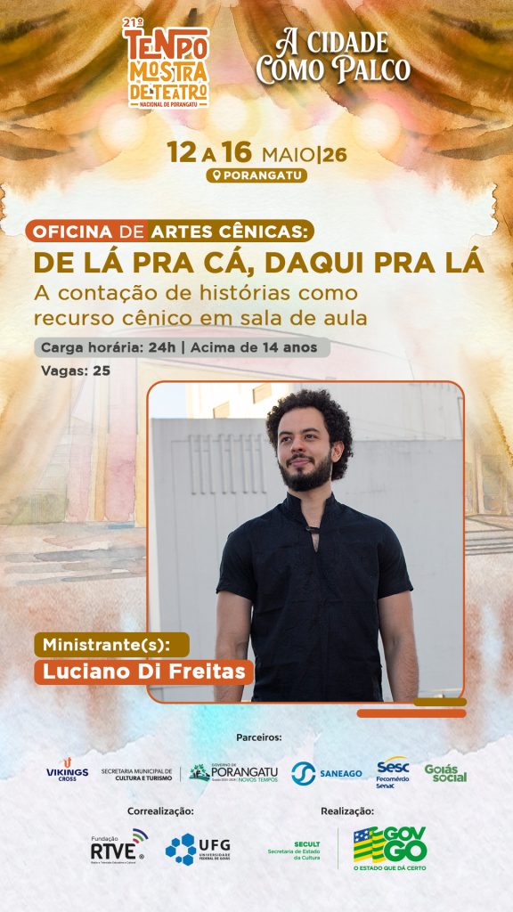Ao todo, estão previstas vagas distribuídas em modalidades de oficinas cênicas, com propostas voltadas tanto para artistas quanto para educadores. Entre as atividades, está a oficina “De lá pra cá, daqui pra lá: A contação de histórias como recurso cênico em sala de aula”, ministrada por Luciano Di Freitas, que propõe uma imersão prática na arte de narrar histórias a partir de técnicas das artes cênicas e do Teatro do Oprimido.