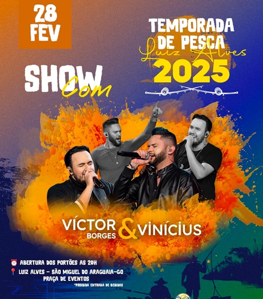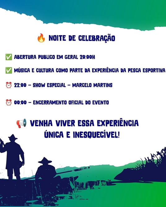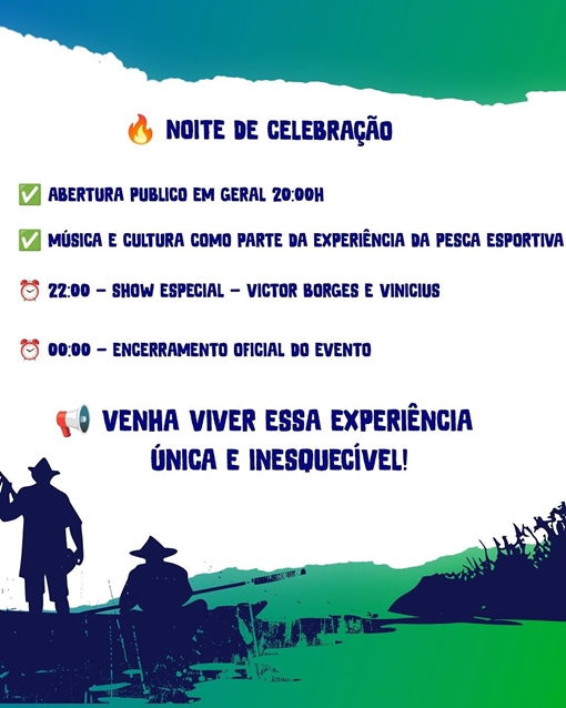 E o melhor, no dia 01 de março: Abertura Oficial da Temporada de Pesca. Vai ter pescaria de tucunaré, campeonato de arremesso de Pesca com prêmio especial da Greenfisher Tralha Completa, Churrasco Santiago Churrascol com boi aberto, fogo de chão e carreteiro e ainda um show com Victor e Neto pra fechar com chave de ouro.