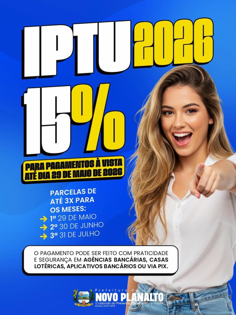 A Prefeitura de Novo Planalto anunciou condições especiais para o pagamento do IPTU 2026, com o objetivo de incentivar a regularização dos tributos municipais e fortalecer os investimentos na cidade.